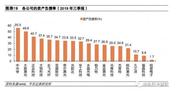 激光裝備制造業并不是一個高負債的行業,從2019 年 Q3 的數據看,相關上市公司中僅一家資產負債率高于50%。