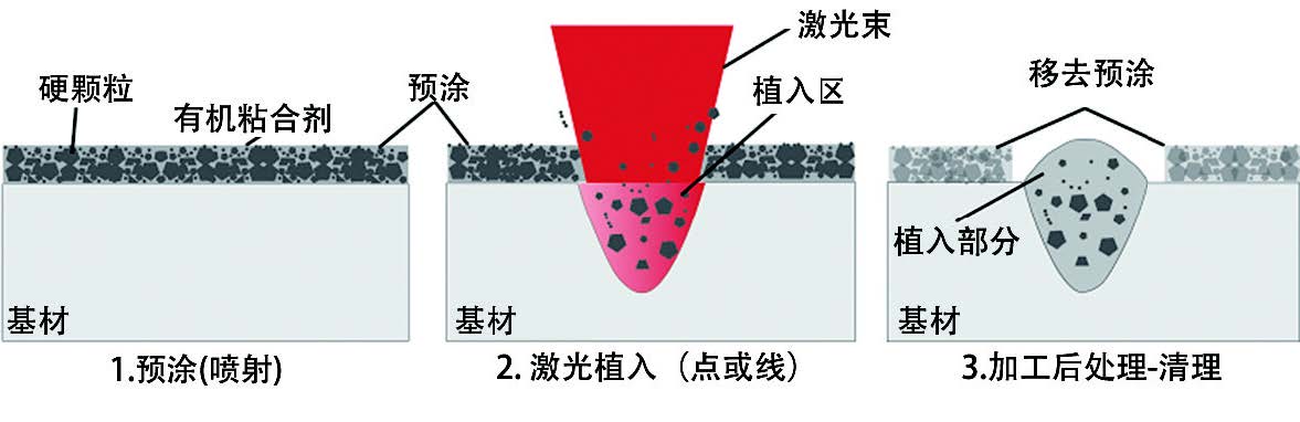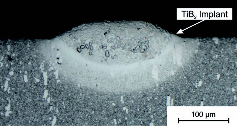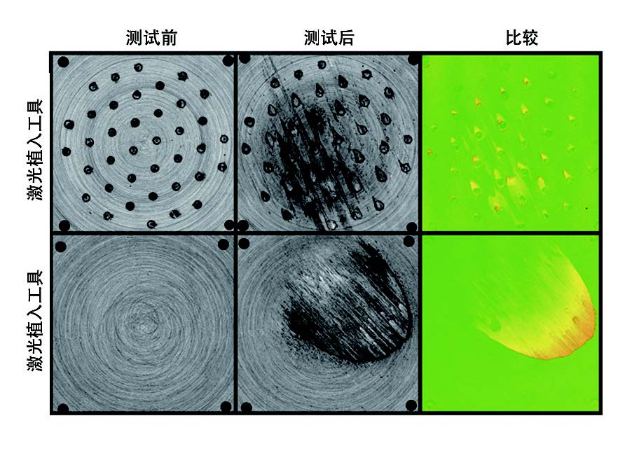 研究人員們計劃使用一種稱為激光植入的技術來解決這個問題,該技術主要為——使用脈沖激光在表面內(nèi)使表面局部分散出鈦化合物(例如 TiN,TiC,TiB2 等鈦化合物制成)的硬陶瓷顆粒,來產(chǎn)生微結構從而表現(xiàn)出耐磨性能。通過使用激光植入技術,就可以在沖壓工具的表面上產(chǎn)生圓頂狀的微結構,尤其當使用 TiB2 顆粒時,可以提供高達1600維氏的硬度值。根據(jù) Spranger 的研究,這些微結構已被證明在減少成形工具的磨損方面非常有效。
