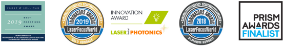 美國NUBURU公司自AO系列150W及500W兩款激光器推出后,先后獲得Prism Awards 2018、LaserFocusWorld 2019 及Frost Sullivan Awards 2019等多項大獎。