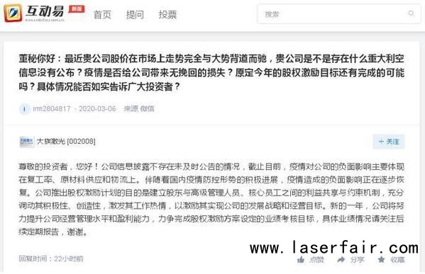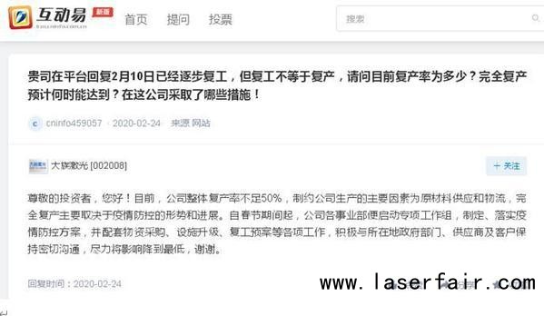 至于何時能完全復工復產(chǎn),大族激光激光則表示完全復產(chǎn)主要取決于疫情防控的形勢和進展。