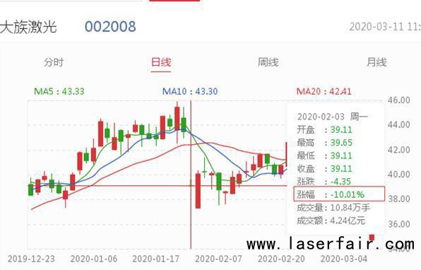 深交所數(shù)據(jù)顯示,今年以來,大族激光在四個交易里日跌幅超5%,分別為3月9日,收盤價35.62元/股,漲跌幅為-6.51%;2月28日,收盤價為38.09元/股,漲跌幅為-5.58%;2月26日,收盤價為40.75元/股,漲跌幅為-6.32%;2月3日,收盤價為39.11元/股,漲跌幅為-10.01%。顯而易見,其中最高日跌幅超10%。