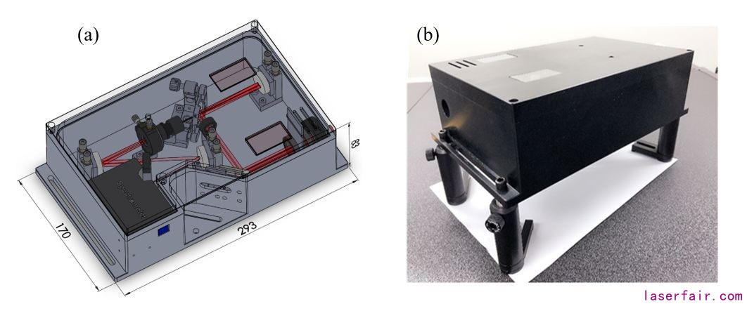 (a)全反射式TG-SRSI的裝置示意圖,尺寸:293 mm×170 mm×83 mm ;(b)置于A4紙上的全反射式裝置實物照片
