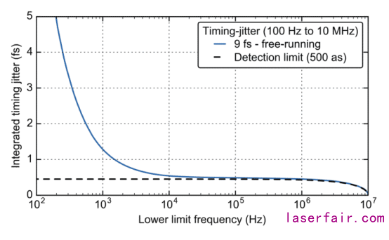 Menhir Photonics 為高精度時基分配提供極低位相噪聲、高可靠度的鎖模激光器。圖1展示了250MHz重復頻率的MenHIR-1550 的典型位相噪聲。相位噪聲在10GHz載波(40階諧波)上測量。噪聲本底給出的累積時間抖動上限越為500as(阿秒)。