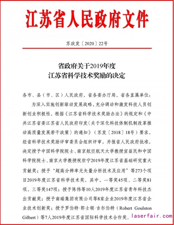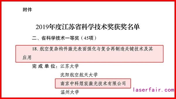 近日,江蘇省政府發布了《關于2019年度江蘇省科學技術獎勵的決定》,共有273個項目獲獎,其中中科煜宸與江蘇大學、沈陽航空航天大學等共同申報的“航空復雜構件激光表面強化與復合再制造關鍵技術及其應用”獲得江蘇省科學技術一等獎!