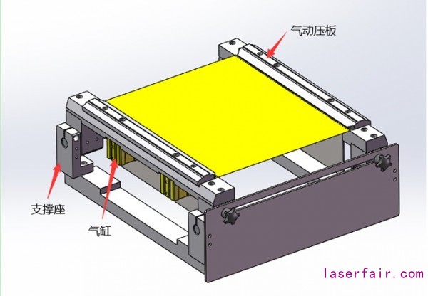 (2) 氣動壓板:用于連接氣缸,通過氣缸的伸縮達到松夾板材的效果。