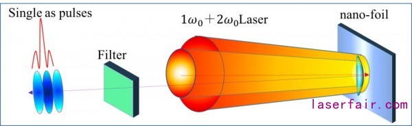 圖 1:雙色激光與納米薄靶相互作用產生孤立的高亮阿秒脈光的模型圖