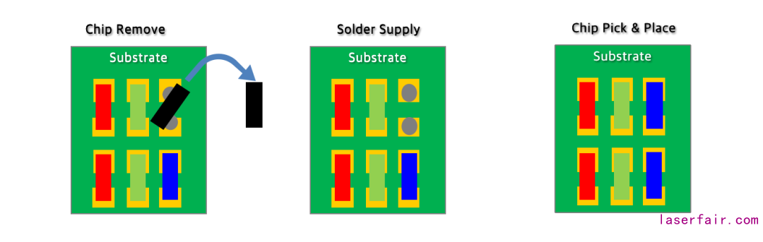 精密 Pick & Place 來可以移除個別 Chip, Chip 移除后, 在 PAD 上點膠小量錫膏