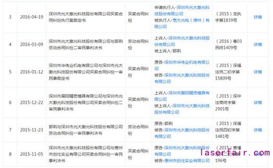 光大激光的歷史法律訴訟更多,且大多數(shù)也為買賣合同糾紛,如深圳市華偉業(yè)機電有限公司與光大激光買賣合同糾紛、深圳市展陽精密模具有限公司與光大激光買賣合同糾紛。