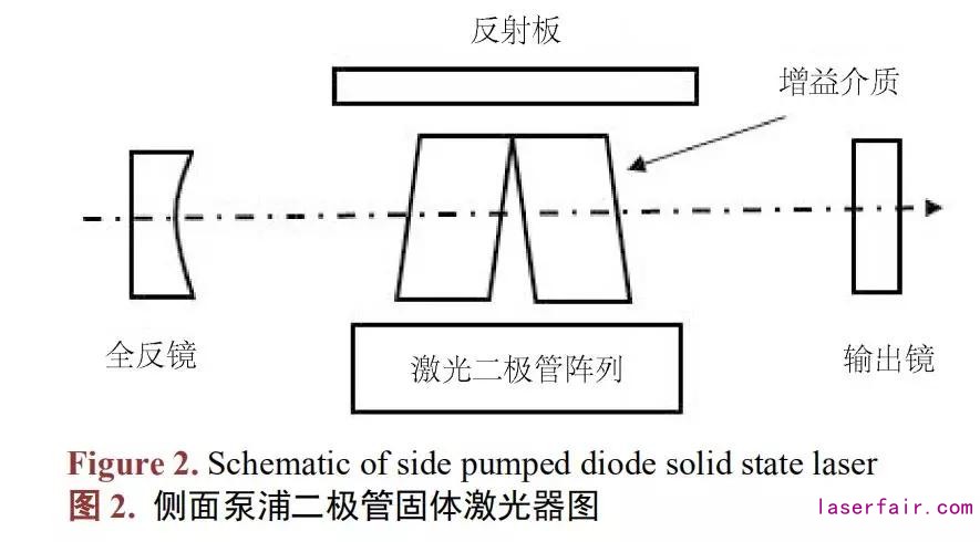 側(cè)面泵浦即橫向泵浦,是指將來自增益介質(zhì)側(cè)面的泵浦光射進到增益介質(zhì)中,并且激光器的模式是沿著增益介質(zhì)的長度進行振蕩。側(cè)面泵浦二極管固體激光器的工作方式是,在板條介質(zhì)的一端用激光二極管陣列,另一端是反射板,使激光大量聚合到增益介質(zhì)中,如圖2所示。通常,為了獲得均勻的激光泵浦分布,側(cè)面泵浦通常采用三向、五向?qū)ΨQ泵浦結(jié)構(gòu)。在五向?qū)ΨQ泵浦結(jié)構(gòu)中,二維陣列封裝在內(nèi)部有冷卻通道的熱沉上,由冷卻劑精確控溫使二維陣列發(fā)射波長在激光晶體的吸收峰附近。冷卻劑同時對激光晶體進行冷卻,激光晶體和二維陣列用石英玻璃管隔開。圍繞著激光晶體棒還設(shè)置了反光塊,用來防止二維陣列的泵浦激光逸出,同時對激光模塊的機械部件進行定位。采取三向、五向?qū)ΨQ泵浦結(jié)構(gòu)的側(cè)面泵浦方式通常能獲得超大功率輸出,側(cè)面泵浦方式被普遍應用于切割太陽能電池板方面的激光劃片、(超)精細雕刻方面的激光打標等需要大功率輸出。