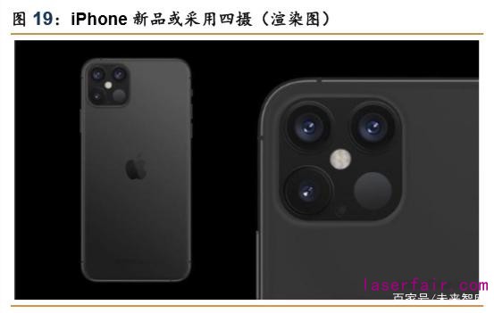 四攝像頭有望落地:在攝像頭方面,iPhone12 有望將 iPhone 11 中的三攝升級(jí)到 四攝,新增加一顆超長焦鏡頭。新增的超長焦鏡頭有望為 iPhone 帶來 2-10 倍的光 學(xué)變焦。攝像頭數(shù)量、排布的再度創(chuàng)新(iPhone 11 為三攝)或帶來藍(lán)寶石鏡頭蓋 板形狀或面積的再度更改。