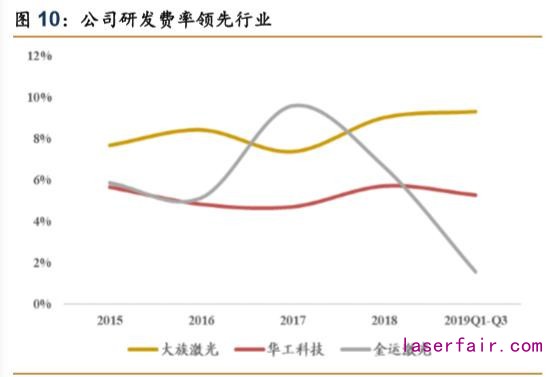研發(fā)投入持續(xù)高位,領(lǐng)先國內(nèi)同行業(yè)企業(yè)。根據(jù)公司 2019 年三季報(bào),公司 2019 前三 季度研發(fā)費(fèi)率為 9.3%,同比+2.0pp,研發(fā)投入持續(xù)增長;橫向?qū)Ρ葋砜矗瑖鴥?nèi)激光設(shè)備行 業(yè)的華工科技同期研發(fā)費(fèi)率為 5.3%、金運(yùn)激光為 1.6%。
