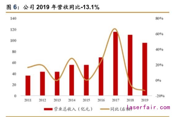 由于公司 2019 年業(yè)績快報(bào)中未披露各業(yè)務(wù)板塊具體收入,我們以 2019 半年報(bào)數(shù)據(jù)為 例對(duì)公司營收結(jié)構(gòu)進(jìn)行拆分。2019H1 公司實(shí)現(xiàn)營收 47.3 億元(同比-7.3%),其中激光設(shè)備 板塊營收 39.7 億元(同比-2.7%),PCB 設(shè)備板塊營收 4.2 億元(同比-37.6%),其他業(yè)務(wù) 營收 3.4 億元(同比-2.3%)。激光設(shè)備板塊中,大功率板塊營收 11.3 億元(同比-5.4%); 小功率營收 28.4 億元,其中小功率板塊可繼續(xù)細(xì)分為:1)消費(fèi)電子營收 8.8 億元(同比 -17.7%);2)面板營收 3.2 億元(同比+7.5%);3)新能源營收 7.1 億元(同比+125.2%); 4)小功率其他業(yè)務(wù)營收 9.3 億元。