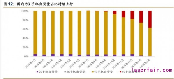 5G 手機(jī)出貨量占比持續(xù)快速提升。根據(jù)中國信通院最新數(shù)據(jù),2020 年 1-2 月,國內(nèi)手 機(jī)市場(chǎng)總體出貨量 2719.7 萬部,同比-44.0%;從出貨結(jié)構(gòu)來看,其中 2G 手機(jī) 38.9 萬部、 4G 手機(jī) 1896.4 萬部,5G 手機(jī) 784.5 萬部。雖然受終端消費(fèi)需求疲軟影響,總體手機(jī)銷量 大幅下降,但 5G 手機(jī)銷量占比持續(xù)快速提升。2020 年 1 月 5G 手機(jī)銷量占比為 26.3%,2 月該比例提升至 37.3%。