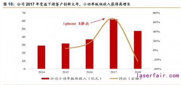 2017 年受益 A 客戶創(chuàng)新大年,公司小功率板塊取得大幅增長。公司自 2008 年獲得蘋 果認(rèn)證切入其產(chǎn)業(yè)鏈,2012 年成功打入蘋果核心供應(yīng)商名單;2017 年受益客戶新品重大創(chuàng) 新帶動(dòng)的產(chǎn)線設(shè)備需求斬獲大量訂單,業(yè)績?nèi)〉酶咚僭鲩L;而 2018-2019 年蘋果創(chuàng)新力度趨 緩,導(dǎo)致對(duì)產(chǎn)線設(shè)備更換需求回落,公司小功率板塊所有承壓。