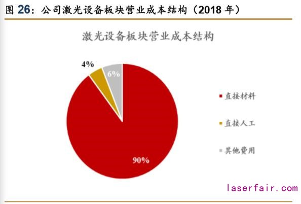 激光器為公司采購成本最高的上游元件。通過拆解公司激光設(shè)備板塊歷年成本結(jié)構(gòu),可 以看出直接材料成本占板塊營業(yè)成本約 90%。進(jìn)一步拆分來看,激光器光源為最大細(xì)分項(xiàng)。 根據(jù)公司 2018 年發(fā)布的可轉(zhuǎn)債募集說明書中數(shù)據(jù),公司外購的原材料主要包括激光器、電 機(jī)平臺(tái)、振鏡等。以 2017H1 為例,激光器、電機(jī)平臺(tái)、振鏡分別占公司原材料采購總額的 35.8%、4.8%、2.5%;從供應(yīng)商來看,公司激光器主要采購自美國 IPG。