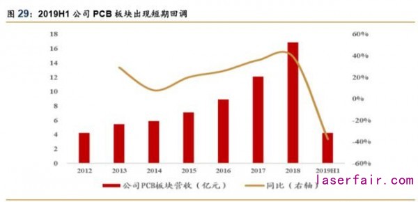 2019 年板塊營收回調(diào),2020 年有望重回高景氣。受中美貿(mào)易摩擦等因素影響,2019 年全球 PCB 產(chǎn)業(yè)出現(xiàn)短期波動(dòng)。根據(jù) Prismark 于 2019 年 Q4 的預(yù)測(cè),2019 年全球 PCB 產(chǎn)值同比-1.7%,這是自 2015 年來全球 PCB 產(chǎn)值首次出現(xiàn)同比下滑;國內(nèi)方面,2019 年國 內(nèi) PCB 產(chǎn)值預(yù)計(jì)同比+0.7%,增速明顯放緩。公司方面,受下游需求趨穩(wěn)影響,PCB 板塊 收入出現(xiàn)暫時(shí)回調(diào),2019H1 板塊營收 4.2 億元,同比-37.6%。我們認(rèn)為隨著國內(nèi) 5G 建設(shè) 的持續(xù)落地,下游客戶延遲的采購訂單預(yù)計(jì)于今年迎來集中釋放期,帶動(dòng)公司 PCB 板塊迎 來景氣度拐點(diǎn),重返上升通道。