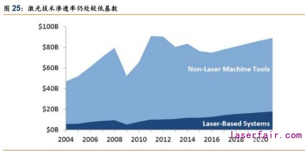 激光技術(shù)滲透率仍處低基數(shù),行業(yè)天花板遠(yuǎn)未達(dá)到。根據(jù) IPG 公布的測(cè)算結(jié)果,目前全 球材料加工設(shè)備市場(chǎng)規(guī)模約 920 億美元,其中激光設(shè)備市場(chǎng)約 140 億美元,占比為 15%。 低滲透率基數(shù)為激光設(shè)備行業(yè)仍然保留了極大發(fā)展空間,行業(yè)天花板遠(yuǎn)未達(dá)到。