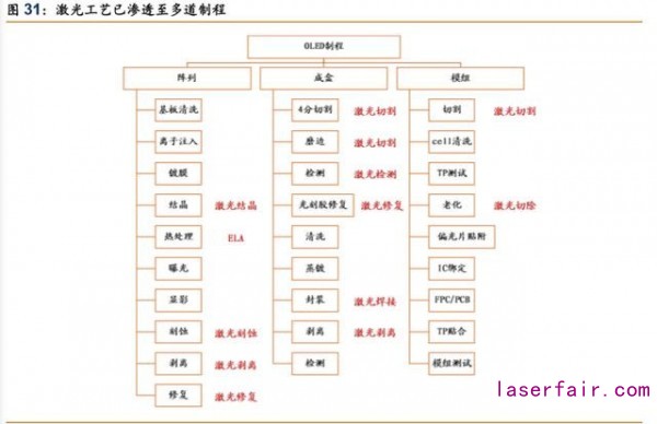 激光工藝在 OLED 生產(chǎn)中已起到至關(guān)重要的作用,目前已滲透至多道生產(chǎn)制程中,帶 來廣闊的激光設(shè)備市場(chǎng)。OLED 產(chǎn)線中主要涉及到的激光工藝包括: