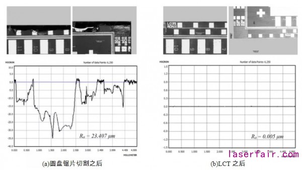將鉆石圓盤鋸片及LCT切割后之芯片斷面品質進行比較,并以型號XP-200的Ambios(美國)表面光度儀測量芯片工作斷面的表面粗糙度(如圖5),鋸片切割后為Rа= 23.407 μm,而LCT后則不大于Rа~0.005μm