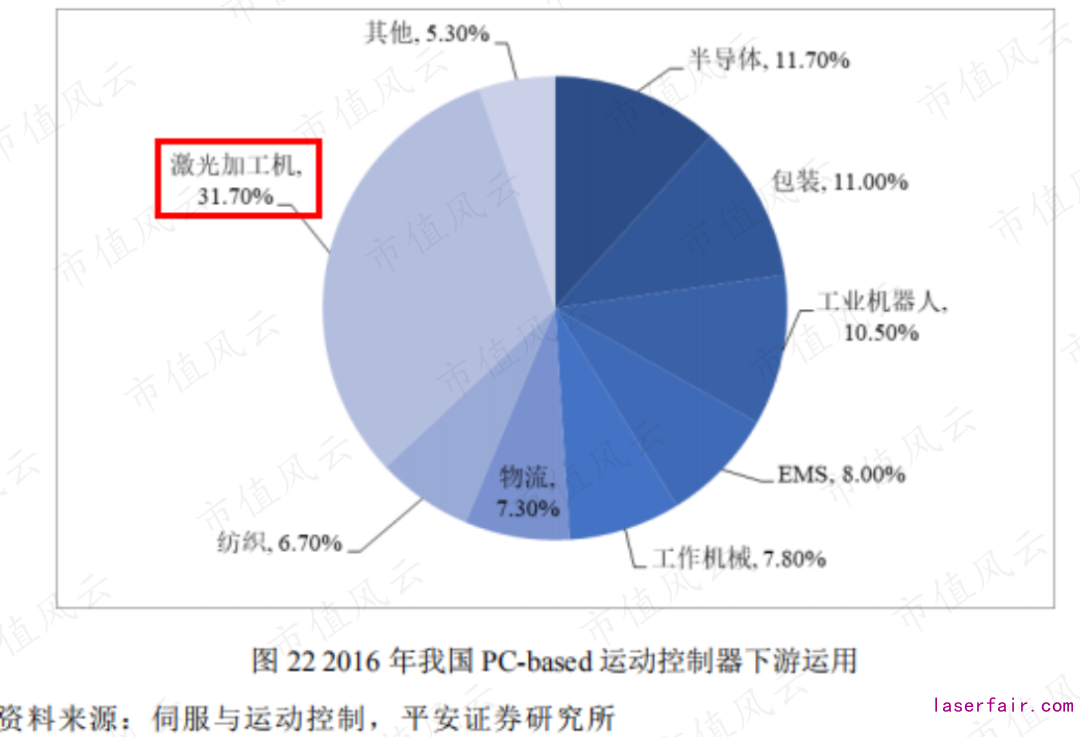 在我國,PC-based運動控制器下游應(yīng)用最多的是激光加工機領(lǐng)域,2016年在所有應(yīng)用領(lǐng)域中占比31.7%。