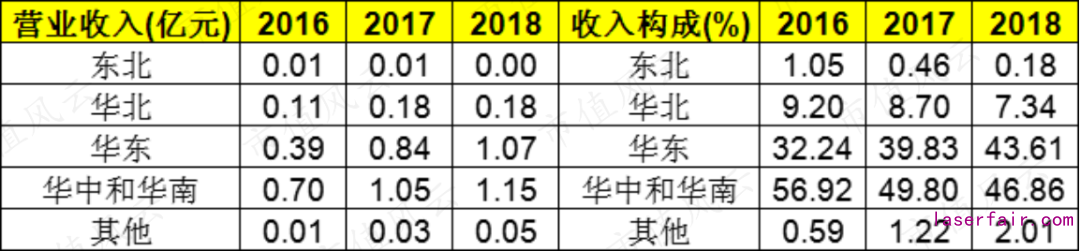 公司銷售主要面向華中、華南和華東,三個區(qū)域收入占比接近90%。