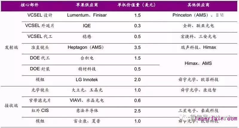 發(fā)射端的元器件大部分是創(chuàng)造了新的產(chǎn)業(yè),價值量較大,在 VCSEL 激光源、準(zhǔn)直鏡頭、DOE 光學(xué)衍射元件、模組等領(lǐng)域給相關(guān)企業(yè)帶來了巨大的全新需求。