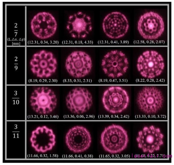 基于象散諧振腔的萬花筒激光器,產生自象散激光腔的多個厄米-高斯光束穿過圓柱透鏡并相互疊加,以形成這些奇特的類似分形的結構光——萬花筒模式,如圖9所示。