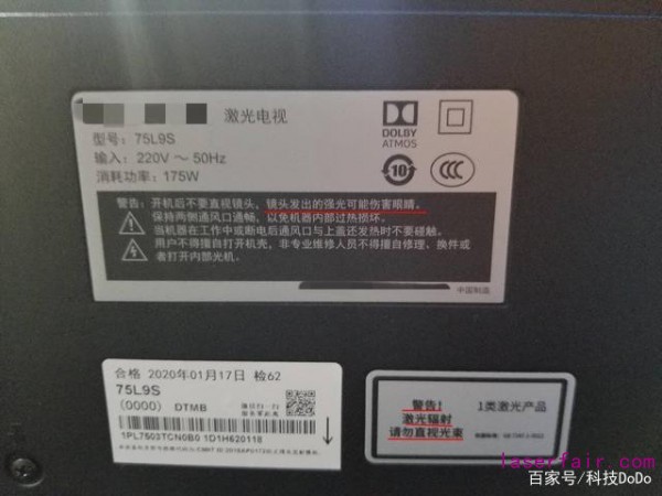 在某激光電視的主機信息上,我們可以很明顯地看到"鏡頭發(fā)出的強光可能傷害眼睛"、"警告!激光輻射,請勿直視光束"等字樣,這也直接讓"激光電視不傷眼"的說法不攻自破。既然廠商都在自己產(chǎn)品上明確標(biāo)注激光危害了,那又何來不傷眼一說呢?