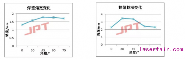 通過實驗數據看出,焊縫熔深隨著吹氣角度的增大先增大,后減小,在0°或大于45°時,熔深都快速減小,當吹氣角度為30°時,焊縫熔深達到最大。