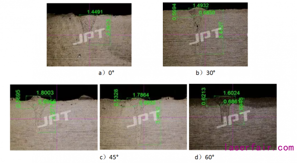 保護氣對焊縫形貌的影響主要是通過控制等離子體的大小來決定激光到達工件表面的功率密度,觀察焊縫橫截面金相圖,可以看出在0°或75°時,焊縫形貌傾向于熱導焊模式,在30°和45°時,呈現明顯的深熔焊形貌。