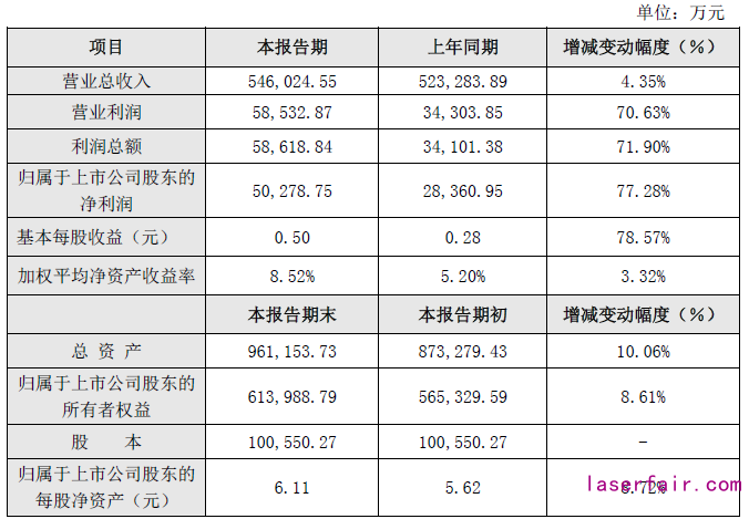 華工科技指出,2019年度華工科技秉持“積極發(fā)展,有效管控,全面提升經(jīng)營質(zhì)量”的思路,面向價值客戶精準發(fā)力,不遺余力提高市場份額,堅持開放式創(chuàng)新,進一步推動產(chǎn)品結(jié)構(gòu)轉(zhuǎn)型升級。本報告期,公司實現(xiàn)營業(yè)收入54.6億元,同比增長4.35%,歸屬母公司凈利潤5.03億元,同比增長77.28%,剔除交易性金融資產(chǎn)影響,扣非后凈利潤2.39億元,同比增長21.76%,公司經(jīng)營駛?cè)敫哔|(zhì)量發(fā)展通道。