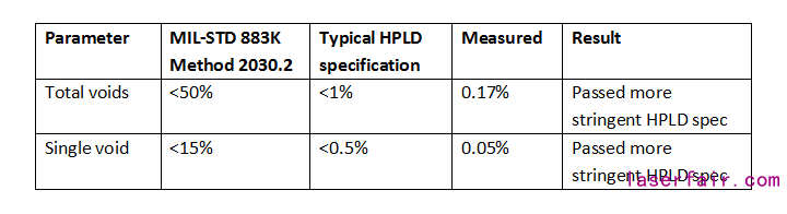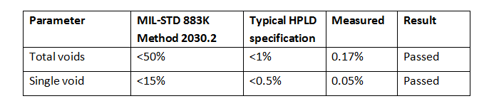 ??空洞百分比的結果總結體現在表4中。貼片后空洞百分比超過了MIL-STD 883K方法2030.2規范,達到了更嚴格的HPLD指標。