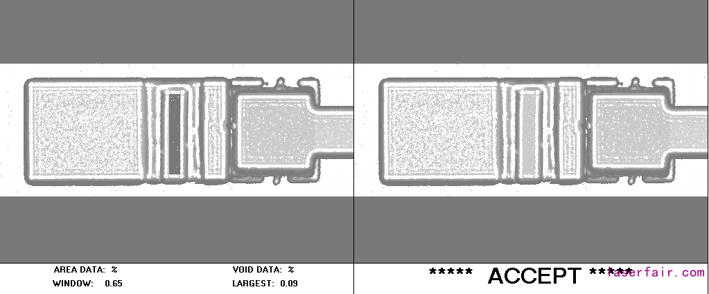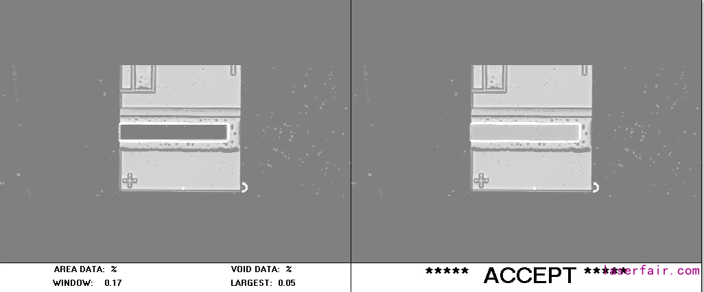 ??除了幾何位置分析之外,我們還對樣品進行了超聲掃描顯微鏡(SAM)測試,以檢測焊接界面中的空洞百分比。圖3描繪了對單管激光芯片(4mm x500μmx120μm)AuSn共晶貼片到AlN基板在Sonoscan D-9000系列C-SAM機器上拍攝的圖像。