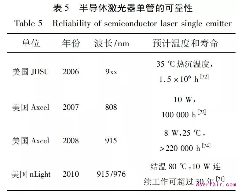 近年來(lái),由于半導(dǎo)體激光器轉(zhuǎn)換效率的提升和封裝散熱工程的改進(jìn),半導(dǎo)體激光器單管報(bào)道的最長(zhǎng)壽命很多已達(dá)到十萬(wàn)小時(shí)以上,線(xiàn)陣的可靠性也有了非常明顯的提高。單管和 bar 條的研究進(jìn)展如表 5 和表 6所示。