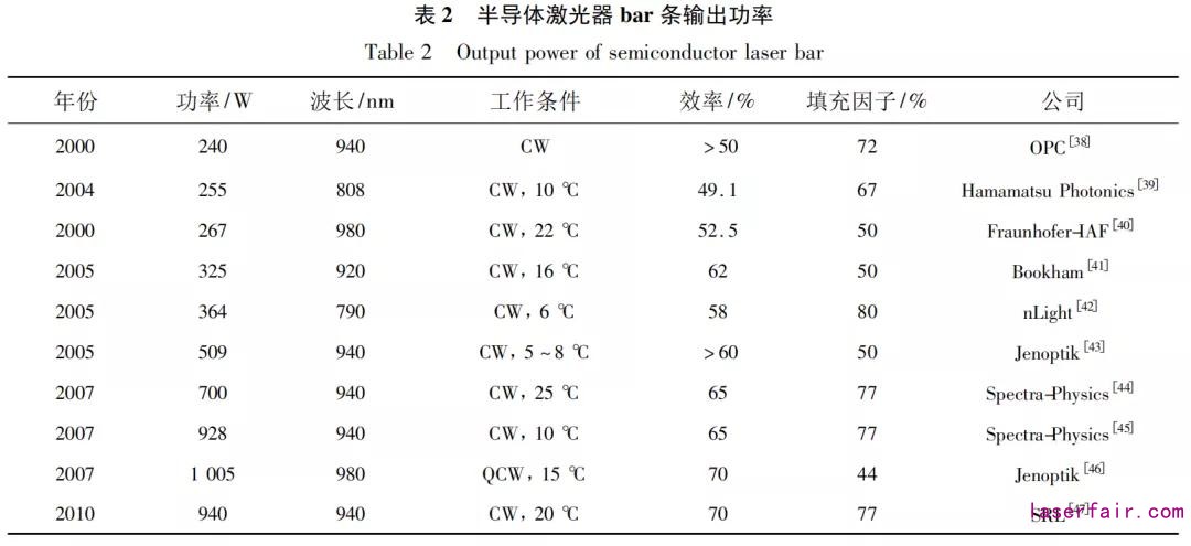 隨著技術(shù)發(fā)展和單管輸出功率的提高,半導(dǎo)體激光bar條的輸出功率也顯著增加。厘米 bar條的輸出功率從 2000 年時(shí)的 240 W 已經(jīng)提高至1 000 W 左右,增大到原來(lái)的 4 倍,增長(zhǎng)非常迅速,如表 2 所示。