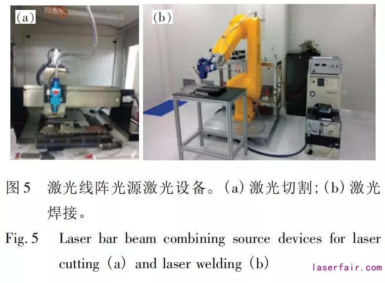基于線(xiàn)陣合束光源,我 們 研 制 出 200 μm / 0.2NA光纖連續(xù) 400 W 功率輸出的激光器,可用于薄不銹鋼板的切割; 研制出 200 μm /0.2NA 光纖連續(xù) 3 000 W 功率輸出的激光器,用于金屬板焊接。設(shè)備照片如圖 5 所示。