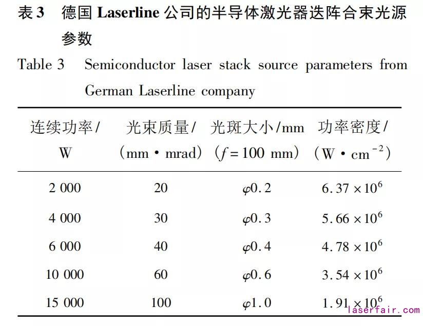 德國(guó)Laserline公司基于激光器迭陣,結(jié)合平行平板堆整形方法和激光合束技術(shù),已研制出了多種半導(dǎo)體激光直接加工機(jī),代表參數(shù)如表 3 所示。15 kW 功率的光束質(zhì)量為 100 mm·mrad,2 kW 功率的光束質(zhì)量為20 mm·mrad,后者超過(guò)了相同功率下燈泵 Nd∶ YAG 激光的光束質(zhì)量。該公司半導(dǎo)體激光光源保質(zhì)期長(zhǎng)達(dá) 5 年( 43 800 h) ,是燈泵 Nd∶ YAG 激光( < 2 000 h) 的數(shù)十倍,這使得它在材料加工市場(chǎng)非常具有競(jìng)爭(zhēng)力。目前該公司產(chǎn)品已直接應(yīng)用在熔覆、表面強(qiáng)化、金屬焊接和深熔焊等材料加工領(lǐng)域。