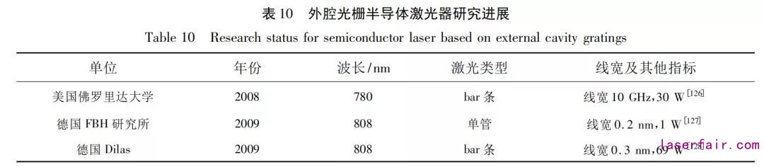 外腔光柵激光器是通過(guò)外部光柵元件的反饋和激光器腔體的諧振實(shí)現(xiàn)穩(wěn)定波長(zhǎng)的目的。通常外腔激光器由于采用了比較長(zhǎng)的腔長(zhǎng)和針對(duì)特定縱模有選擇性反射的外腔光柵,可以窄化激光器線(xiàn)寬并且工作在單頻率狀態(tài)。其研究進(jìn)展如表10 所示。