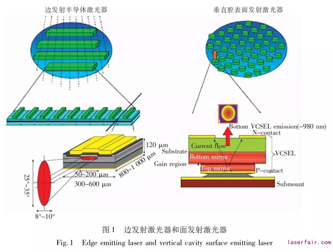 1977 年,日本東京工業(yè)大學(xué)的伊賀健一( Kenichi Iga) 提出垂直腔面發(fā)射激光器( Vertical- cavity surface-emitting laser,VCSEL) 的概念,其工作原理如圖 1 所示。這種激光器由于光學(xué)諧振腔與半導(dǎo)體芯片的襯底垂直,因此能夠?qū)崿F(xiàn)芯片表面的激光發(fā)射,有著低閾值電流、穩(wěn)定單波長(zhǎng)工作、可高頻調(diào)制、容易二維集成、沒(méi)有腔面閾值損傷等優(yōu)點(diǎn)。隨著材料生長(zhǎng)工藝的成熟和器件結(jié)構(gòu)的優(yōu)化,VCSEL器件在低閾值電流及室溫工作等方面取得了一系列進(jìn)展,并于1988年實(shí)現(xiàn)了室溫連續(xù)激射。目前,VCSEL已經(jīng)在光通信、光互連、激光引信、激光顯示、光信號(hào)處理以及芯片級(jí)原子鐘等領(lǐng)域獲得了廣泛的應(yīng)用。