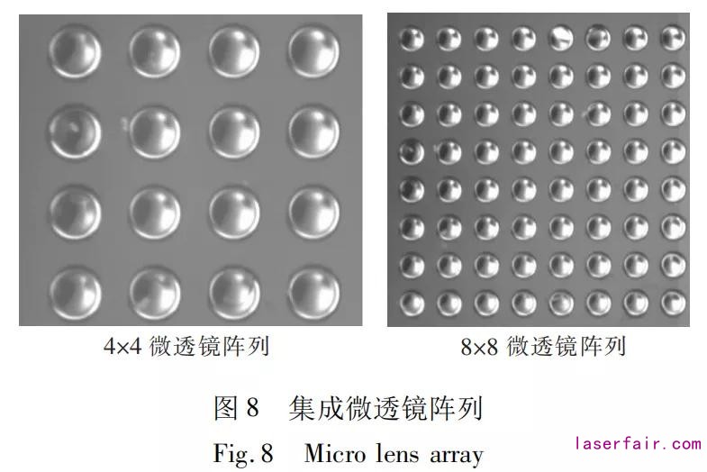 2010 年,我們?cè)趪?guó)際上首次提出并實(shí)現(xiàn)了大功率 VCSEL 集成面陣與其微透鏡面陣的單片集成,6 × 6 VCSEL 集成微透鏡陣列實(shí)現(xiàn)了 1.0 W基模激光輸出,發(fā)散角由 14. 8°降到 6. 6°,光束質(zhì)量獲得成倍改善,為發(fā)展高光束質(zhì)量大規(guī)模集成列陣激光開(kāi)辟了新方向。圖 8 為集成微透鏡陣列照片。