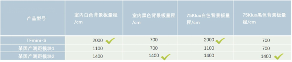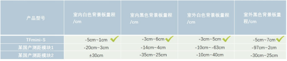 表一、TFmini-S與其他測距模塊在室內外測距量程對比表