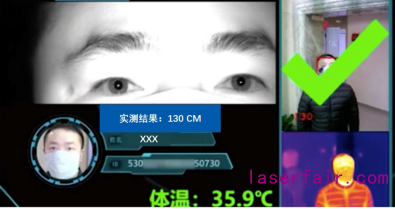 春節復工期間,在上海某園區已投入的非接觸測溫智能終端設備,面向戴口罩的員工,實行“虹膜人臉識別+遠距離測溫”功能,杜絕接觸式感染,即刻測溫。依靠北醒激光雷達的精準測距功能,測溫智能終端可以快速聚焦到人體虹膜,測溫同時,可以通過虹膜快速識別員工身份。