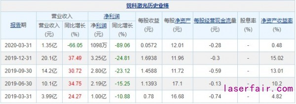 銳科激光一季度凈利潤1098萬元 同比下降89%