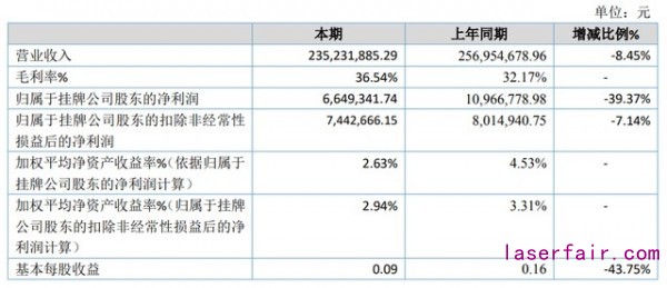 據了解,報告期內天弘激光營業收入為235,231,885.29元,較上年同期下降8.45%;主要原因為:第一,激光切割機主要為標準化產品,市場競爭激烈,銷售單價低,毛利也相對較低,整體收入較上年同期減少了16.80%;第二,高功率及新能源激光焊接機,主要為非標應用,未按預期實現批量推廣,較上年同期降低了37.23%;第三,激光微加工系列產品較上年同期增加了67.41%。
