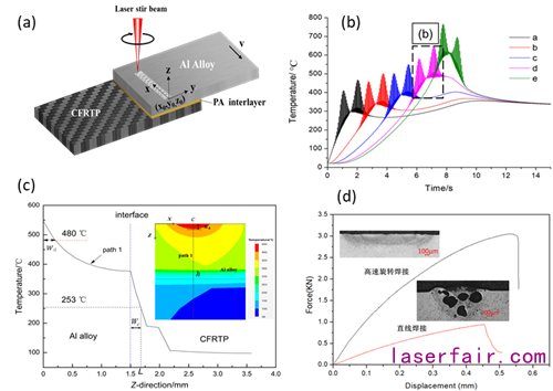 圖1 鋁合金-CFRTP激光旋轉焊接技術:(a)鋁合金-CFRTP激光旋轉焊接模型;(b)鋁合金-CFRTP結合界面溫度變化;(c)深度方向溫度變化;(d)高速旋轉焊接與直線焊接對金屬基體熱損傷、焊接強度的影響對比
