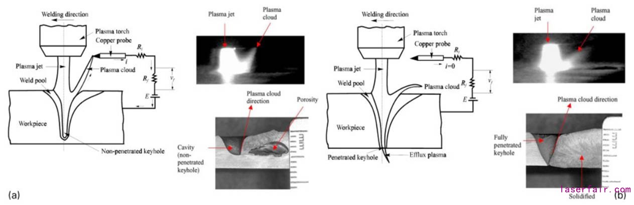 由于在焊接時(shí)產(chǎn)生的等離子體包含電離子和負(fù)離子,焊接噴嘴和焊接工件之間的電壓可以由一個(gè)電容和電阻組成的回路來(lái)進(jìn)行探測(cè)。早期研究結(jié)果表明等離子電荷傳感對(duì)于測(cè)量等離子體溫度非常有用。該技術(shù)一般用來(lái)識(shí)別焊接深度和焊接缺陷,如匙孔造成的失效、穿孔、光束位置偏離和焊道錯(cuò)位等。相應(yīng)地,這些研究已經(jīng)用于激光焊接的探測(cè)。W.Lu認(rèn)為非常有必要確定等離子電荷和焊接深度之間的關(guān)系。大多數(shù)等離子電荷傳感器均直接同激光頭或噴嘴相連接。Zhang及其團(tuán)隊(duì)設(shè)計(jì)了一個(gè)測(cè)量回路并不是同噴嘴相連接的,該裝置包含一個(gè)探測(cè)頭,其位置是可變的。如圖5所示。當(dāng)探頭在工件表面3-6mm且在電極后方軸線方向8-12mm時(shí),此時(shí)的回路可以有效的區(qū)分完全穿透焊接和部分穿透焊接。相似的研究在弧焊、電子束焊接以及等離子體焊接過(guò)程中均存在。激光焊接的作用原理在本質(zhì)上同以上過(guò)程是一樣的,并且所有的焊接過(guò)程中存在均存在等離子體。