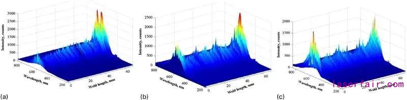 早期的研究表明,鋁合金的焊接缺陷,如咬邊和飛濺等,不僅整個(gè)光譜的輻射得到加強(qiáng),就連鋁的譜線也同時(shí)得到加強(qiáng)。如在激光焊接鍍鋅板時(shí),Zn(或Fe)的電子溫度同特征缺陷是明顯相關(guān)聯(lián)的,此時(shí)溫度并不對(duì)焊接深度敏感。此外,羽狀物譜線的強(qiáng)度可以用來(lái)幫助識(shí)別焊接速度的變化,如圖3所示。