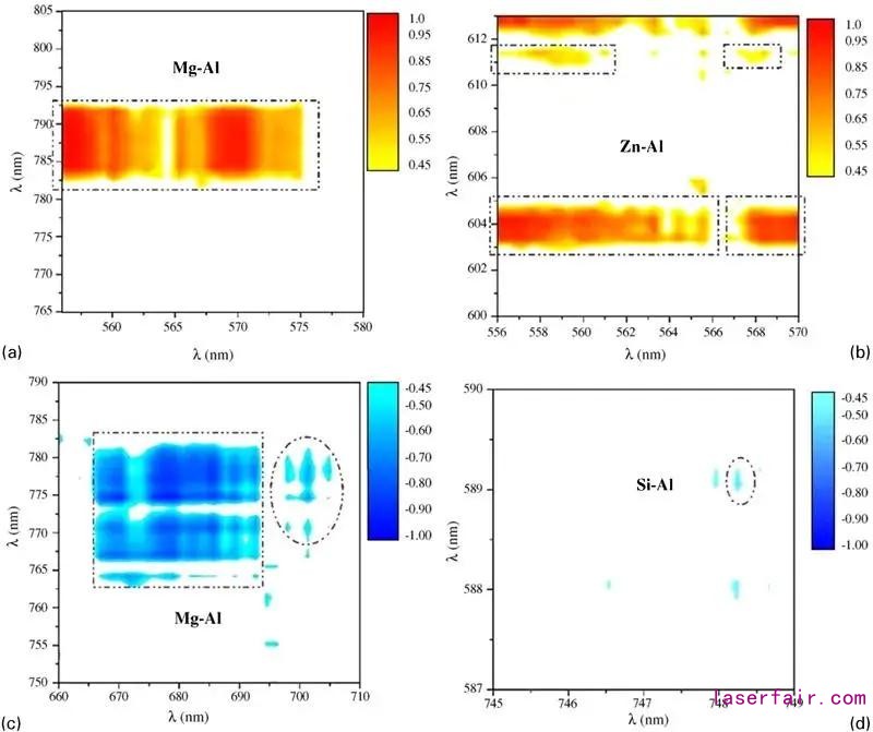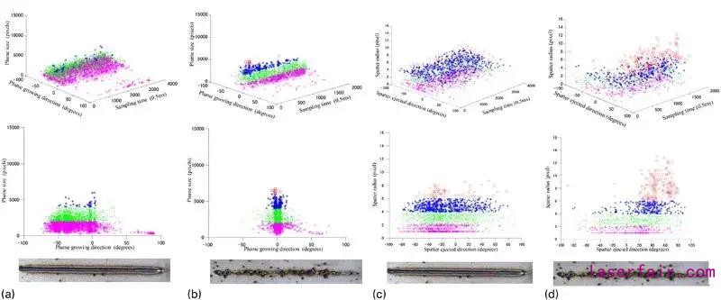 在Sibillano團(tuán)隊(duì)的研究方案中,采用海洋光學(xué)的低成本光譜分析儀進(jìn)行缺陷探測(cè)和自適應(yīng)控制的研究。基于對(duì)光譜的相關(guān)性分析,他們研究了不同保護(hù)氣體速率的條件下的羽狀物的動(dòng)力學(xué)特征,如圖4所示。圖4a和b為氣體流速為40NL每分鐘的時(shí)候,其相關(guān)性為正。然而,如圖4c和d所示,當(dāng)氣體流速為100NL每分鐘的時(shí)候,其相關(guān)性為負(fù)值。