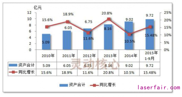 2015年1-9月,我國光纖激光器行業資產合計達到了9.72億元,同比增長了15.5%。2014年,我國光纖激光器行業資產合計達到了9.02億元,同比增長了10.5%。