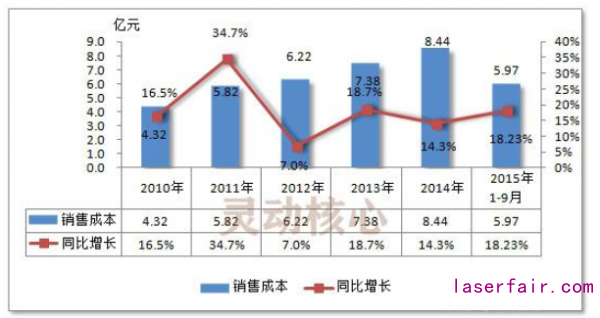 2015年1-9月,我國光纖激光器行業銷售成本達到了5.97億元,同比增長了18.2%。2014年,我國光纖激光器行業銷售成本達到了8.44億元,同比增長了14.3%。